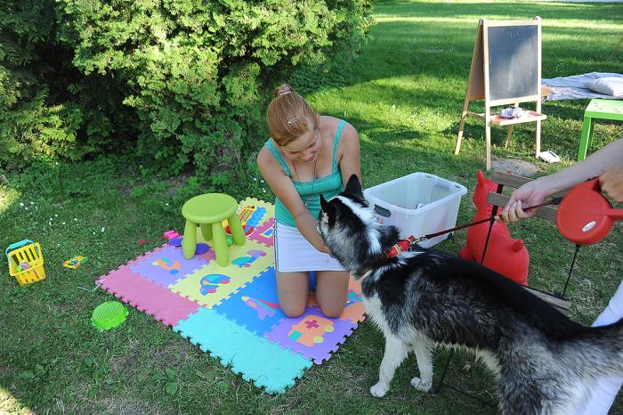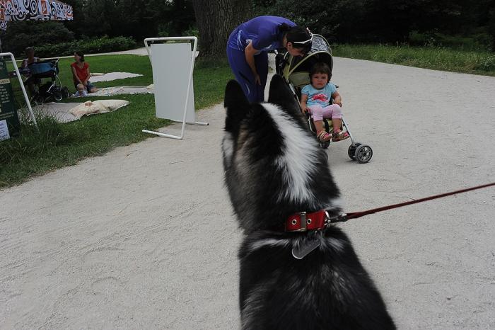 Правда, потом Дукти реабилитировался. Как истинный тимуровец, успокоил своим видом рыдающую девочку – мама была крайне благодарна. Удивительно как положительно влияет на детей эта наглая морда! Сначала ребенок гримасу страдания превращает в маску трагедии, потом глаза становятся кругло-восторженными, ручки тянутся к собаке, улыбка до ушей. Ура! Если еще дать подержаться за зверя, — а многие родители просят об этом, — малыш и не вспомнит, о чём рыдал… Правда, потом его сложно оторвать от шкуры… Но это пустяки — не велика издержка за хорошее настроение.