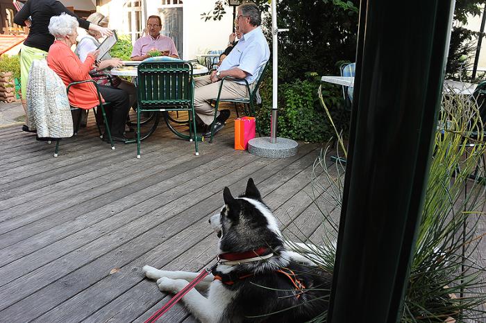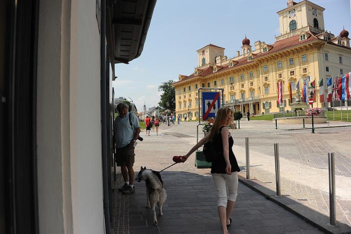 Под Веной попали в длиннющую пробку и приехали в Айзенштадт непростительно поздно. Настолько поздно, что все кафешки были уже закрыты. Но ресепшен (отель Бургенланд) — в виде обаятельной женщины средних лет — встретил нас с распростертыми объятиями. Вру, конечно же не нас, а Дукти. А мы с Машкой были настолько голодны, что как примазавшийся довесок, набрались смелости и спросили нельзя ли здесь где-нибудь что-нибудь съесть. Эта милая дама буквально в дверях остановила уходящего домой бармена, заставила его сделать нам чай, нарезать бутерброды, и крайне извинялась за отсутствие чего-либо горячего – кухня-мол закрыта. Кроме того, она снабдила нас информацией о том, где лучше (дешевле) припарковать машину и где ближайшая мясная лавка. И вообще потрепались мы на славу (обсудили и моих детей, и её внуков). Ну а Дукти молниеносно получил свой таз с водой.