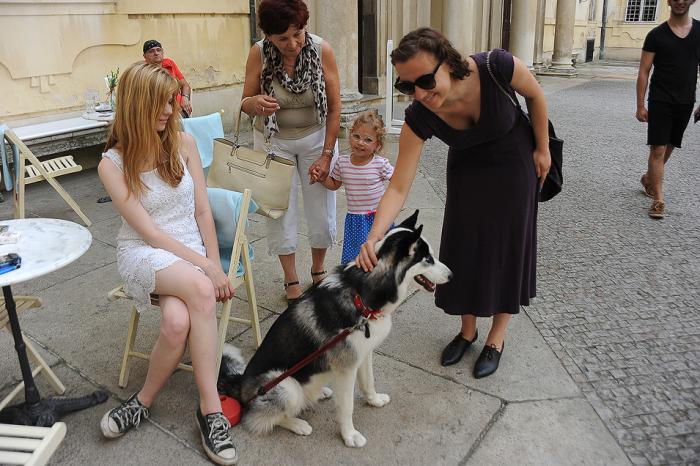 бежит в музей. В гордом одиночестве мы просидели не долго. Дело в том, что это было не совсем кафе, а винный бар. За соседним столиком с бокалом сидел очень симпатичный мужчина, который сначала приглядывался к нашей компании, а потом решил поговорить. Оказалось, он тоже когда-то был владельцем хаски, а на данный момент его питомец – алабай. Завязалась беседа. Рассказал много хасячьих историй – и про своего питомца, и про знакомых зверей. Помню самую страшную, про его друга. Тот решил попробовать прокатиться на скейте, используя в качестве тягловой силы помесь хася с маламутом. Прокатился… до ближайшего дерева… с черепно-мозговой… Вывод: учить надо! Протрепались мы где-то с час. Когда новый знакомец раскланялся, мы перебазировались в другую кафешку — во дворе дворца. Время полетело незаметно,
