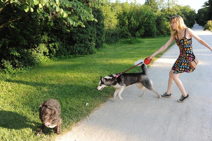 Собак в парке видимо-невидимо! Кто-то гуляет сам по себе, кто-то на поводке, кто-то в сумке. Дуктяша такое количество собратьев видел только на собачьей площадке. Но там все знакомые, да и надо было учиться, а тут… А тут я, как главный кормилец, недосмотрела… Точнее не нашла в этом славном городке мясную лавку, и сумочка для натаски была пуста. Из чего следовало, что любые команды не просто глупы, но и вредны (рефлексы-то еще не устаканены). Короче, зверя тащило во все стороны одновременно. А я только и думала, как бы пополнить запас зверо-вкусняшек.