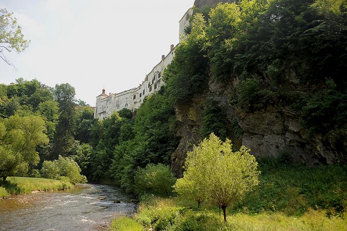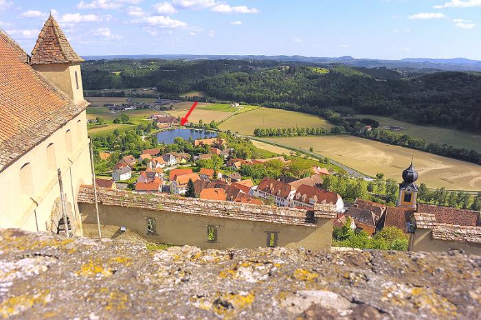 А из моих фото: там где речка течёт (это его боковая, скрытая часть — крепостная) и там, где Дукти тащит Маруську на гору (это его парадный вход — замковый). Фотография с высокой горой и замком — это Ригерсбург.