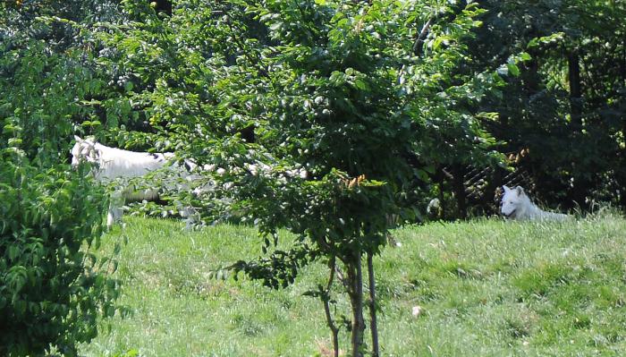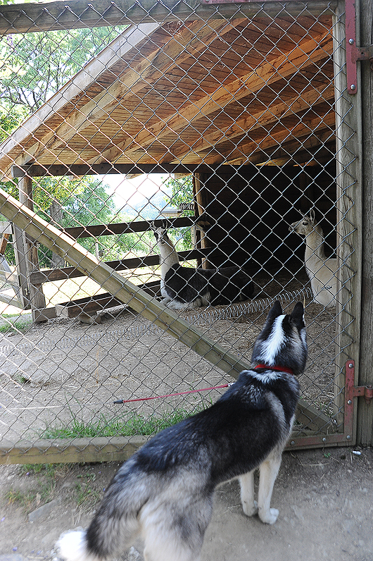 Полярные волки. Когда мы подошли к их владениям ни одного волка видно не было. Дукти понюхал воздух, сел и начал тихонечко подвывать, потом громче. Сбежался народ. Мы прилипли к изгороди. Дукти пел уже во все горло. И наконец они появились. Сначала один. Постоял, посмотрел. Ушел. Но через секунду привел еще нескольких. Подходить близко не стали, только прошли стороной. Нашего зверя немного подтрясывало от напряжения.