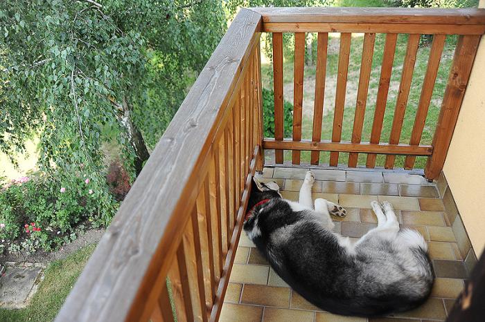 В комнате было жарковато, и зверь всю ночь провалялся на открытом воздухе. Утром его пришлось будить и, фактически, пинками вести на прогулку (морда была не выспавшаяся и крайне недовольная).