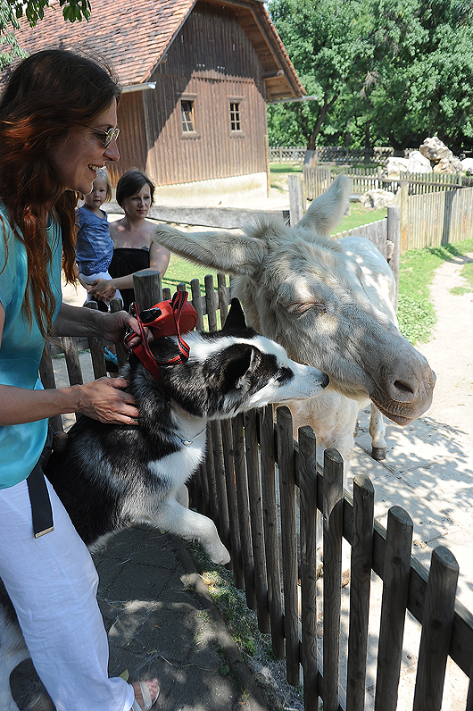 Потом Дукти решил обойти козий вольер по периметру, дабы познакомиться с этими странными существами поближе. И тут он наткнулся на ОСЛА – осла №2. Наш парень рванул что было сил. Я его поймала в прыжке, но лизнуть осла он все же успел.
