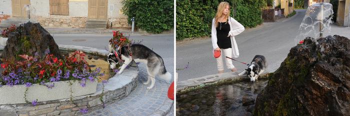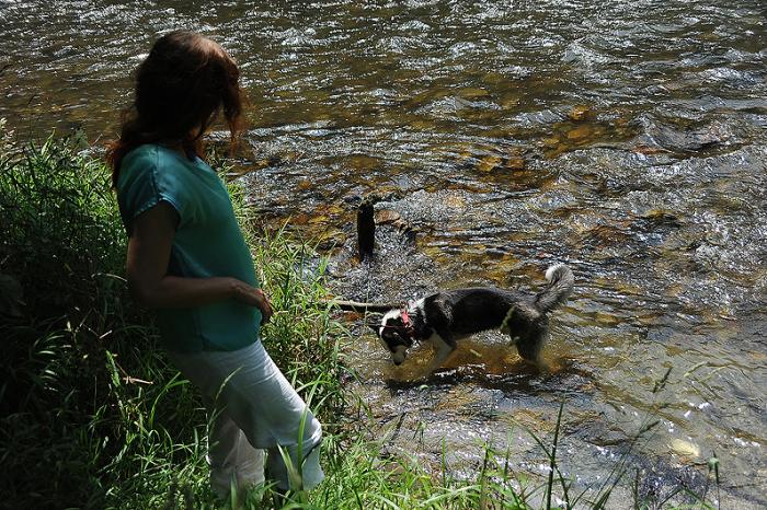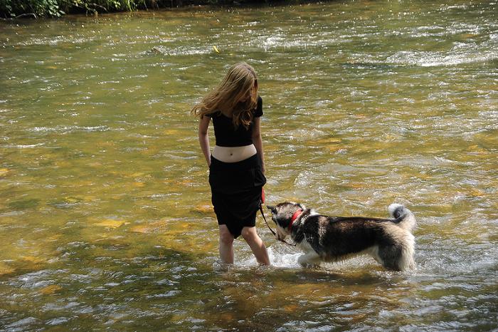 Но дальше нас ждала речка. День был жарким – понятно, что зверь захочет искупаться. Из моего предыдущего опыта, я знала, что по весне она была бурным потоком, вполне способным унести не только такую мелочь как собаку, но и вполне увесистого пони. В каком состоянии пребывает река на данный конкретный момент – информации не было. Для того, чтобы это узнать, надо было обогнуть скалу, на которой стоит замок. Мы перестраховались и нацепили на Дукти поводок. Конечно же, он тут же полез в воду. Холоднющая – жуть!