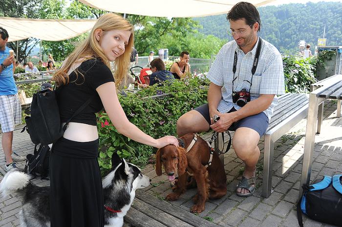 А вот пожилая девочка ретривер. На заднем плане, я надеюсь, можно разглядеть синюю табличку «Hundetränke» — там стоит миска с водой для собак (но Дуктяшин мощный торс ее закрывает)