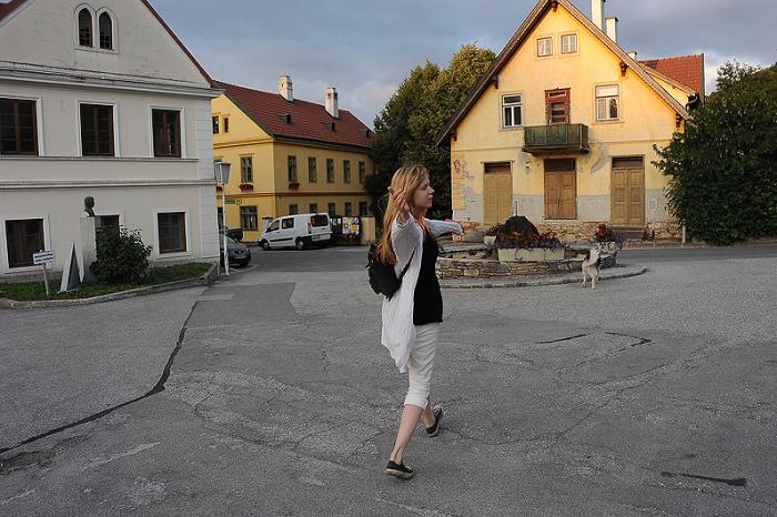 А вот с едой проблемы были: гаштет нашего отеля работал уже только как пивнушка, а кафе по соседству могло предложить только мороженое (ну и напитки, конечно). Одним мороженым сыт не будешь… Спросили, куда деваться голодному туристу в это время суток, и нас послали на прудик (я его отметила на фотографии красной стрелкой). Увы, фотоаппарат я с собой не взяла. Так что придется верить мне на слово. Сам пруд огорожен и представляет собой зону отдыха типа «бассейн». Там есть раздевалки, лежаки, душ, ресторан. Вход через турникет. С собаками на территорию можно, но купаться им там нельзя.