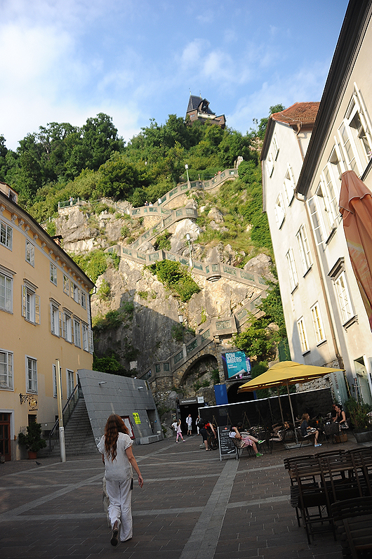 Короче, купили два купальника, туфельки, шлепки… Устали, сами понимаете кАк… И оказались у входа в лифт (на Шлоссбергплац), что ведет на гору. Дуктяша попил из фонтана,