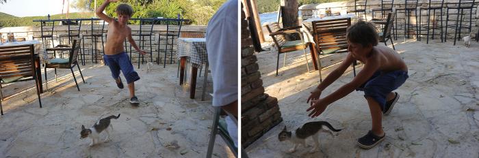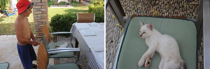 Именно по этой причине уважительно-снисходительное отношение к кошкам – норма и для греков, и для черногорцев. Вот как выглядит среднестатистический греческий ресторанчик на сей предмет.