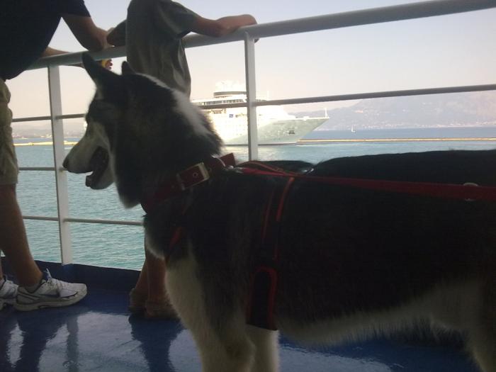 Сначала я себя чувствовала там несколько напряженно: одна, даже внутрь к магазинчику за кофе не сходишь — с собаками нельзя. На дворе день и Дукти не спит, а только ищет братьев по разуму (таковых было трое, и нам, хозяевам было довольно проблематично разойтись по разным палубам: то с одной, то с другой стороны солнцепек). Но все наладилось, как только мы с Дуктяшей обнаружили очень милый закуток под навесом. А совсем хорошо стало после того, как к нашей компании присоединилась очень детная (семеро) греческая семья, глава которой – мама,- отлично говорила по-немецки. Я смогла полностью расслабиться и даже сходить за кофейком – Дукти был в надежных детских руках.