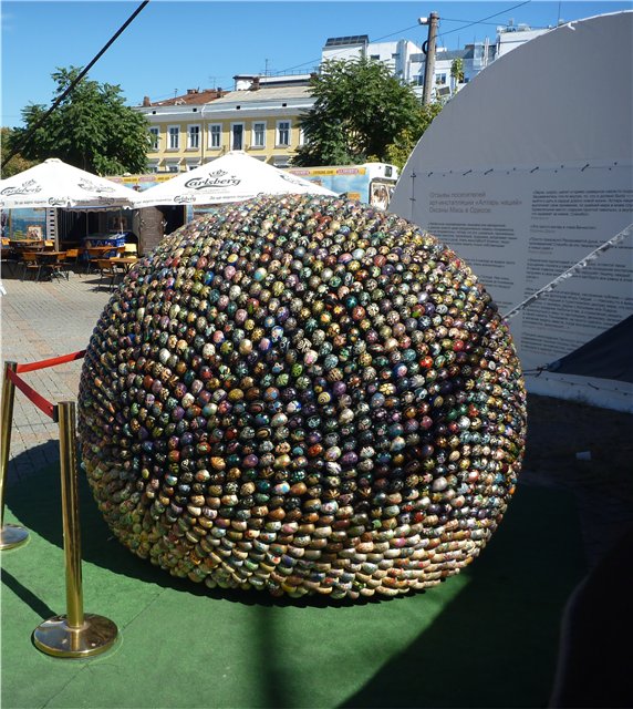 На Дерибасовой был накрыт шатер с выставкой какой-то художницы, у шатра стояла фигура из пасхальных яиц в форме шара.
