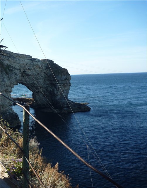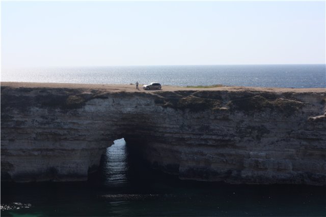 Как оказалось – территория огорожена, внутри домики, некое подобие турбазы – выкуплена частниками, и просто так посмотреть нельзя! После долгих уговоров и споров с охранником, сошлись на том, что даем ему за фотосессию по 20 грн с че-ка и он нас пускает. Внутри особо ничего интересного – только сам Атлеш в основном пещера внизу, с арками. Спустившись вниз (лестница очень узкая и с резким наклоном затяжным – дамы наврятли будут спускаться), увидели стоянку лодок дайверов, с оборудованием, сделав пару кадров, вернулись обратно. От машины был виден малый Атлеш, т.к. мы были рядом, то решили его тоже осмотреть – но понимали, что ничего сверхъестественного нас там не ждет. Перед ним на дороге попался овраг средней степени наклонности (основная дорога лежала через него), из машины казалось это мероприятие непреодолимым, слишком был крутоват уклон да еще по диагонали, но выйдя из машины и осмотрев местность – решили рискнуть. Сид справился, и вот мы подъезжаем к малому Атлешу.