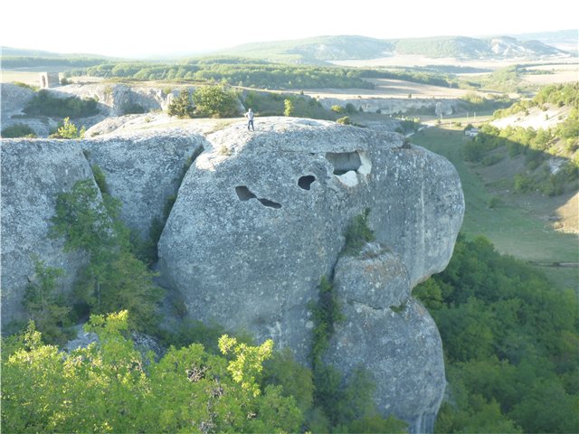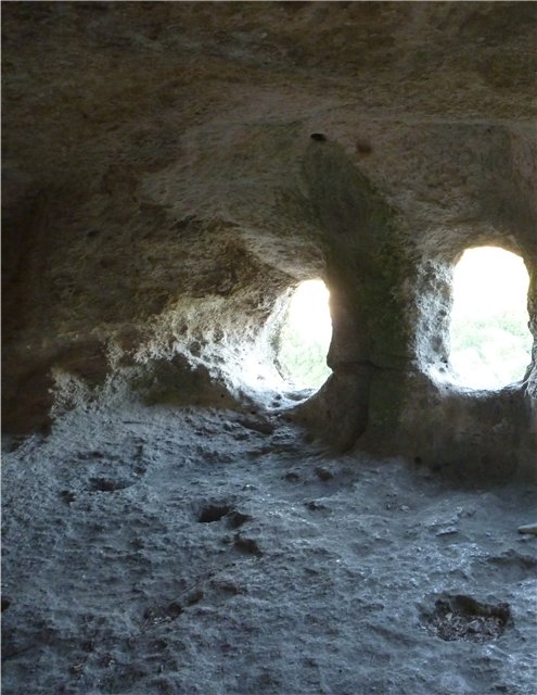 По соседней горе ходил турист (видимо проживающий на турбазе) и фотографировал пещеры. Все время пока мы были на горах, были слышны выстрелы (скорее всего на территории турбазы есть тир, либо кто-то охотился). Периодически приходилось преодолевать легкие скалистые подъемы и всорабкиваться по сделанным из веток лестницам (поэтому совет – одевайтесь в спортивную одежду с кроссовками, мы спижонили и пришлось ходить в брюках и ботинках). Пещеры идут по степени нарастания (удаленности) – сначала маленькие и к концу горы большие залы, несколько ярусные пещеры с лазами, в общем, увлекательное зрелище. Как в те времена народ смог в горных породах сделать город?!