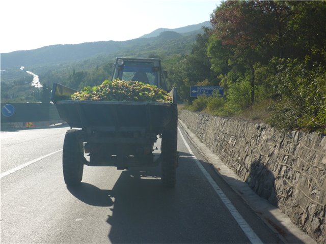 Пошли деревни с интересными названиями – Батарейка, За Родину. Мошка облепляла машину, т.к. море было рядом. В районе Темрюка тоже были виноградники и коньячный завод. Встретился грузовик с виноградом …