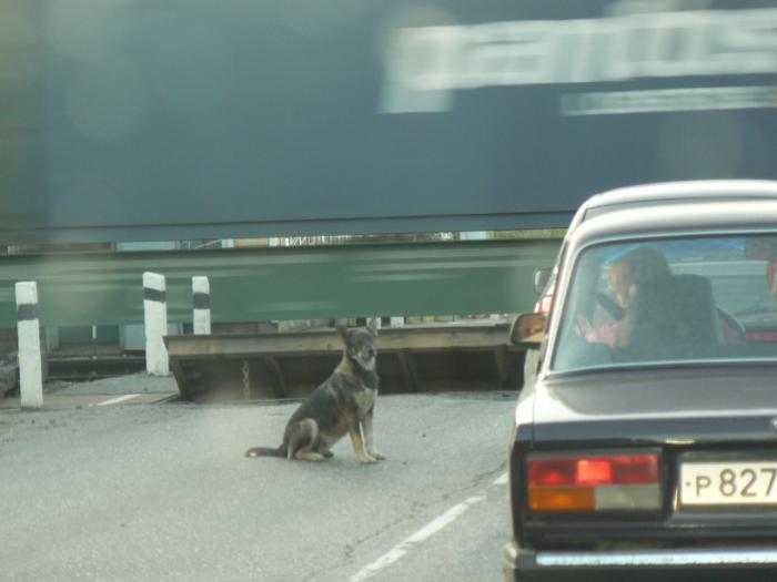 Далее свернув под Рязанью вправо, дорога тоже хорошего качества, проходит через лес. Большая часть дорога шириной в две полосы, поэтому иногда обгоны проходили с трудностями, плюс еще и «серпантин» по лесу, узкие обочины. Бог миловал от лесных зверушек на трассе, поэтому проехали без эксцессов. На одном из ж/д переездов во время движения поездов просителем «подрабатывает» местная собака.