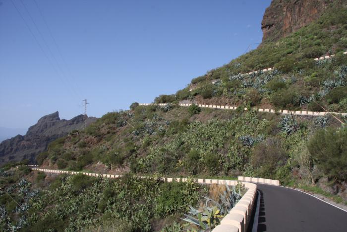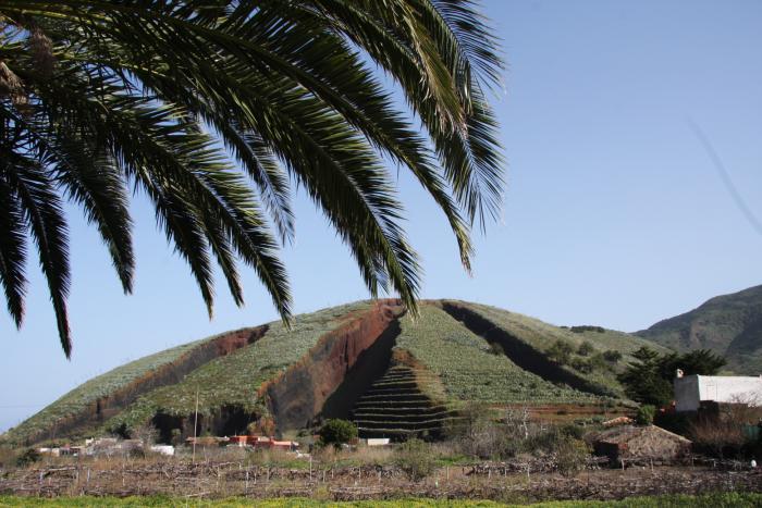 Этой дорогой на Garachico мы ехали впервые. Она оказалась достаточно живописной. По сторонам огороженные территории, где растут бананы, тростник, виноград. Вдоль обочин много кактусов, которые уже готовы поделиться своими алыми плодами. Вдалеке увидели холм странной формы. Похоже его разломило в период вулканической активности. Люди сразу освоили появившиеся земли, видимо плодородные.