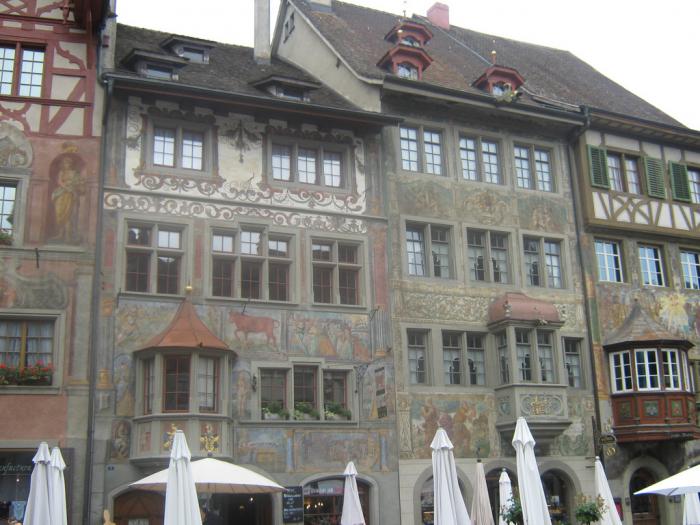 Это прелестный городок на Рейне, где фасады домов расписаны картинами. Далее мы поехали на знаменитый Рейнский водопад (15 км), полюбовались водопадом со всех сторон. Очень красивое место. Затем – Цюрих. Долго искали свободное место для парковки. Наконец нашли, но тут другая проблема надо кинуть в парковочный автомат несколько франков, а у нас только евро. Но повезло. Местный житель сказал, что в этот день праздник и парковка бесплатная. Поэтому мы спокойно пошли гулять по Цюриху. Обошли весь центр, навестили ленинские места.