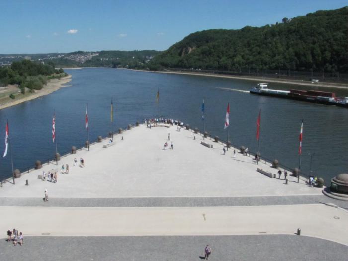 Это грандиозное сооружение с каскадом фонтанов, гроты и бесконечная лестница наверх. Мы ее покорили! Ночевка была в чудном (70 евро) в центре города. Оговорюсь, что при заказе отелей основными требованиями были цена и наличие бесплатной парковки. (пробег за день 400 км)Встав рано утром, мы поехали в Кобленц. Дорога проходит по удивительно красивым холмистым местам. Целью был осмотр «Немецкого угла».