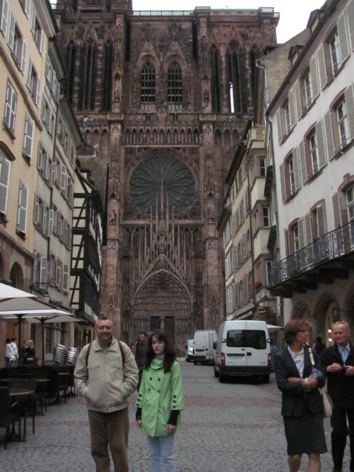 На другой день облом продолжается. Холод, моросит дождь, но Страсбург надо смотреть. Задаем навигатору Страсбургский собор и едем. Подъехали к дворцу и встали, где уже никто не встает и соответственно никаких парковочных автоматов. Но наглость второе счастье. Осмотрели собор – очень величественное сооружение и пошли в район Petit France.