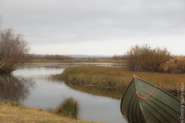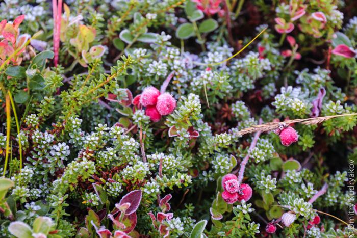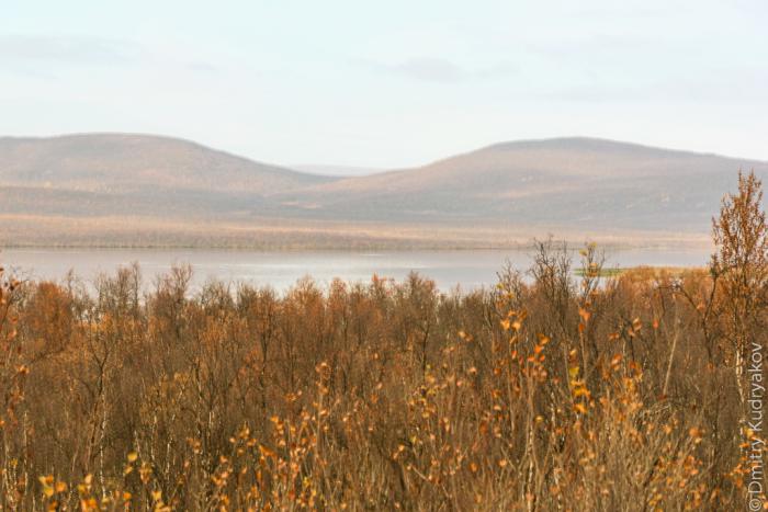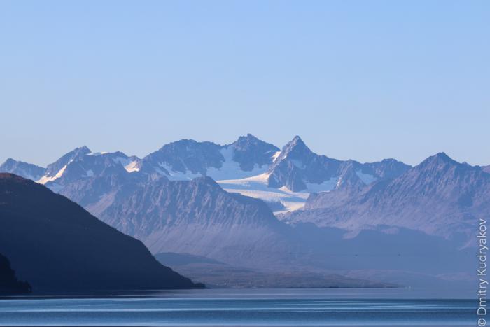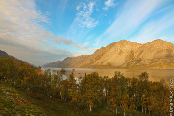 Почти сразу равнинный пейзаж сменяется горным, а рыжая тундра — вполне себе зелеными склонами. На вершинах гор появляется снег.