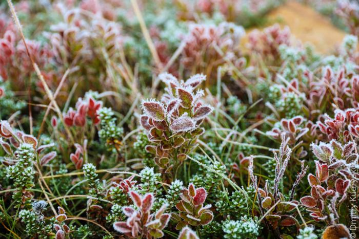 К счастью я зачем-то взял с собой штормовку, запасной свитер и теплые ботинки. Переоделся — одел на себя все, что было с собой, все равно под штормовкой не видно. Стало тепло, отогрелся, машину прогрел, позавтракал и выехал на ледник. Дороги там всего ничего, но вся она замерзла — целые поляны покрыты инеем, толстым слоем.