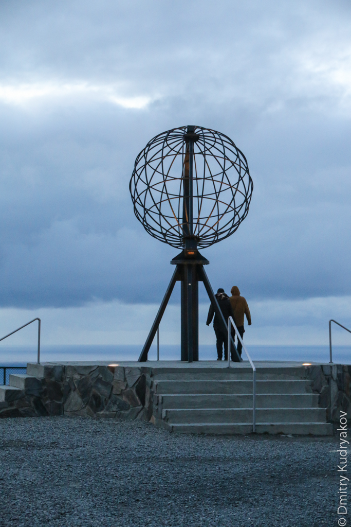 Сумасшедших вроде меня здесь очень мало, время позднее, все закрыто — зато парковка бесплатная. Дует сильнейший ветер, такой сильный только один раз видел до этого — на Крите в ущелье Курталико, аж машину раскачивает. На улице уже темнеет, по морю на нас мчится шторм. Жалея, что нет кирпичей, чтобы набить карманы: “А то унесет”, вылезаю из машины и пытаюсь добраться до “Глобуса”. Руки с фотоаппаратом сдувает, чтобы сделать фотографию, приходится прислонять фотоаппарат к забору. Мимо пробегает пара с собачкой — у собачки высокая парусность и она местами взлетает на поводке, не доставая до земли, но летит низко — к дождю. Быстро делаю несколько фотографий, щупаю глобус и назад в машину. А ветер тем временем крепчает и машину только что не приподнимает. Быстрее разворачиваюсь и рву обратно в Russenes. Уже стемнело и дальнейшая езда больше напоминает полет в космосе — я вижу только небольшой кусок дороги впереди, а вокруг чернота и звезды. В Нордкаптунеле стоит густейший туман, приходится ехать на второй передаче около 40 км/ч. Так, то ныряя в освещенные тоннели, то выскакивая наружу в космическую черноту, добираюсь до цели. На последних метрах меня ожидает сюрприз: асфальт взлетает тысячами бабочек, слетевшихся на влажную дорогу.