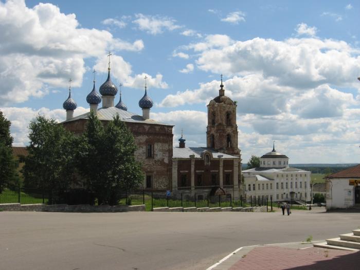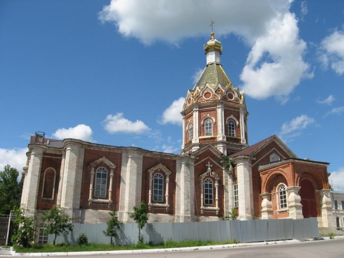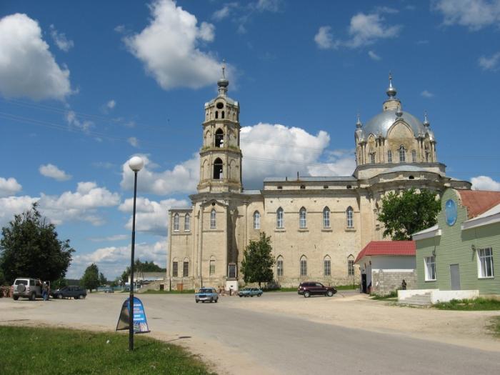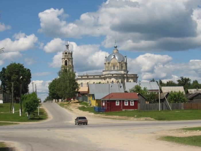 Гусь-Железный. Если вы никогда не были в этом месте, и начали скучать за рулем или уныло смотреть в одну точку, будучи пассажиром, то проснетесь и заинтересуетесь неожиданно возникшим на пригорке в двухстах метрах от трассы грандиозным архитектурным сооружением. Это ни что иное как церковь Живоначальной Троицы (Троицкий собор), строительство которой длилось более полувека и было завершено в середине 19-го столетия.