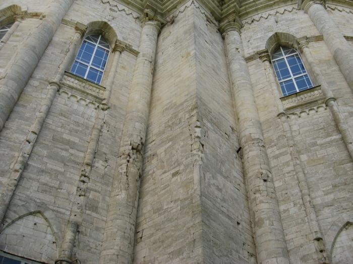 Еще издали поражают размеры храма, а подъехав к нему, вы впечатлитесь еще больше. И есть чем. Вертикальные стены высотой с 5-этажный дом плюс колокольня над центральным порталом примерно такой же высоты. Стены серого цвета из обточенного камня c очень скромным, минималистским, орнаментом. Кроме них фасад представлен тонкими во всю высоту стен колоннами и, что самое интересное, по-готически вытянутыми, заостренными кверху оконными сводами, расположенными в два ряда по всему периметру.