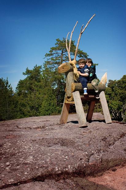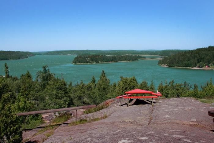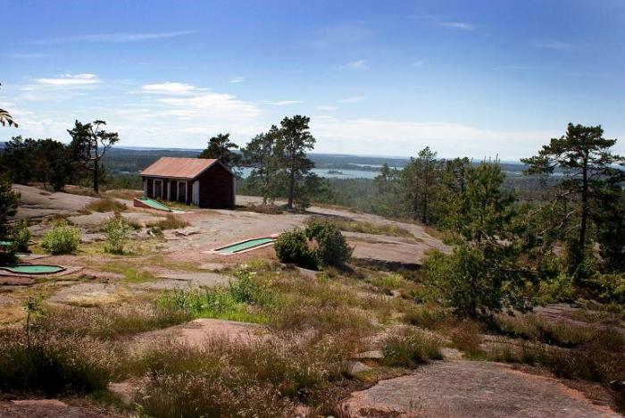 Сегодня у нас по плану Север архипелага и столица на Юге. Нашел ошибку в нитке маршрута: дорога от Экерё до Геты показана с учетом небольшого парома — хотели проехаться по морю, полюбоваться природой. Оказалось, что паром там только для людей и велосипедов. «С машиной никак не можно» — развел руками машинист (водитель? капитан?) парома, пришлось ехать в объезд. На Севере расположено местечко Гета, самая высокая точка Аландов. Вид с нее открывается воистину потрясающий, горы, море, ветер, маленькие кривые сосенки! Правда ходить по гранитным склонам нужно очень осторожно, они покрыты мхом и лишайником… особенно во время дождя… особенно с детьми… Наверху стоит подзорная труба, есть площадки для мини-гольфа, а еще есть небольшое озеро, в котором плавают карпы. Ну и ресторан, конечно, куда ж без него? Обедаем на террасе после прогулки, погода радует. Чек получился 65Е с детьми, бокалом вина и стаканом пива.