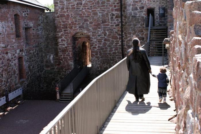 Дальше снова не Запад, нас ждет замок Кастельхольм. Давно ждет, века так с четырнадцатого, было бы свинством не заехать в гости! =) Наполовину восстановленный, наполовину разрушенный. С виду небольшой, но внутри много интересного, несколько человек занимаются привычными средневековыми делами — чинят одежду, точат оружие, ремонтируют какие-то вещи, причем работают с настоящими ископаемыми мечами, ткацкими инструментами… Вход 6Е с тела, дети бесплатно. На парковке рядом встретили земляков, Питерские автомобильные номера было видеть на удивление приятно!