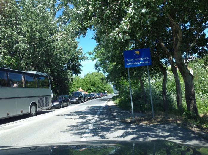 Поплутали по горным тропкам, в г. Меткович выехали на границу с Боснией. 14:25. Стоим в очереди на границе. Впереди машин 10.
