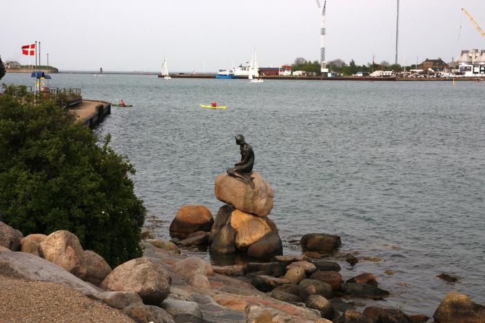 Практически сразу за мостом начинается Копенгаген. Въехали в город около шести вечера по местному времени. Планировали погулять по городу, а на следующий день рано утром отправиться дальше. Так как завтрашний участок у нас был самым продолжительным, предстояло проехать 1000 км. Но вследствие того, что встали рано, гулять сил уже не было. Доехали мы только до «русалочки» (Малката по местному). По дороге остановились около большого пруда (адрес Stockholmsgade 39) чтобы размять ноги и выгулять собаку. Любимое занятие нашего терьера – это гонять уток в парке Победы в Петербурге. Главная задача для него это поднять уток с земли, а дальше уже дело хозяина. Но хозяин, по его мнению, совсем никудышный. Сколько уток согнал, а хозяин еще ни одной не поймал. На берегу местного пруда разгуливали огромные жирные гуси, крупные утки. Птица была непуганая. Берти, это наша собака, получил большое удовольствие, гоняя этих отъевшихся водоплавающих. Но, как известно, гусь птица наглая и сильная. Один из них, оправившись от испуга, полез на берег расправляться с обидчиком. Расправив крылья, и громко шипя, гусь устремился на нашего пса. Берти такой реакции не ожидал и замер на берегу, глуповато поглядывая на нас. Весь его вид говорил: «А чего это он, я так не играю, это не по правилам». Пришлось дать команду «ко мне», чтобы собака отступила с достоинством. Мы прошлись еще немного, вдоль второго пруда, где не было живности, и поехали смотреть «малкату». Гугл выдает эти координаты 55.692862,12.599258. Но я ехал по адресу (навигатор знает). Адрес: 19 Langelinie, Havfrue, 2100 København). Рядом с «русалочкой» есть какое-то учреждение с небольшой парковкой. Парковка была полупустой и мы успешно запарковались. В отличие от парковки возле «русалки» толпился народ, по очереди забираясь поближе к ней.