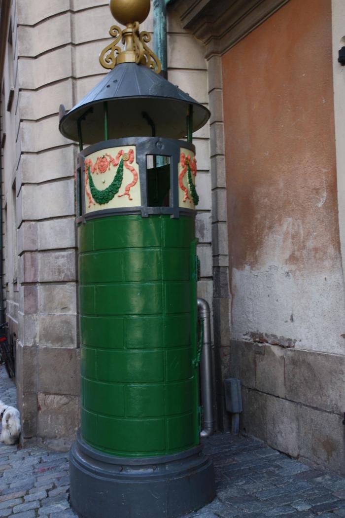 Кстати, лицензия на рыбную ловлю не нужна. По советам «бывалых», лучше всего ловить рыбу около Оперного театра, около моста Strömbron или на острове Skeppsholmen. Еще раз полюбовались видом королевского дворца, поднялись по мощенной булыжником улице Bollhusgränd 4 к церкви святителя Николая. Между церковью и Шведской академией на улице Källargränd находится уличный туалет, больше похожий на тумбу для наклейки афиш.