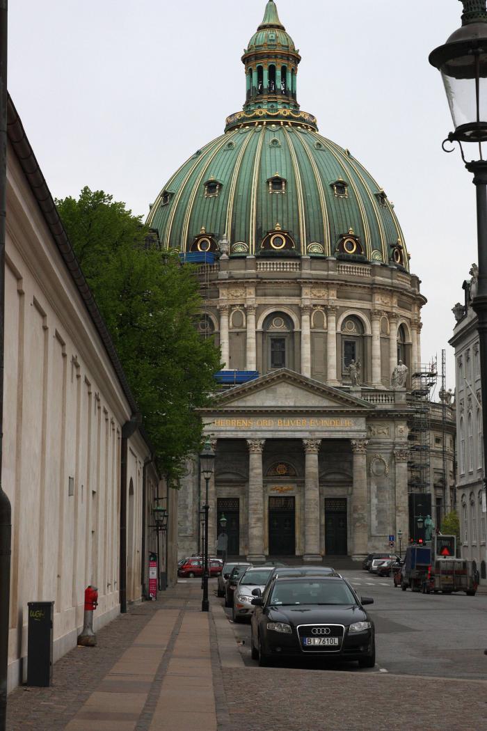 Пока мы ходили по кругу, на площадь влетела кавалькада из нескольких машин. Мы подумали, может король приехал. Один раз в Мадриде мы так случайно наткнулись на короля Испании. Нет, не король, а жалко. Напротив ансамбля Амалиенборг находится церковь Фредерика, также известная как Мраморная церковь (дат. Marmorkirken) — лютеранская церковь, одна из достопримечательностей Копенгагена.