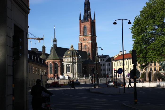Прошли на соседний остров Riddarholmen. Riddarholmen — отдельная часть Гамла Стана, на западе. Здесь расположилась красивейшая церковь Riddarholmskyrkan, с кованым ажурным шпилем. Пройдя остров, насквозь мы вышли на его противоположную сторону, несколько напоминающую стрелку васильевского острова в Петербурге, откуда нам открылась великолепная панорама городской ратуши.