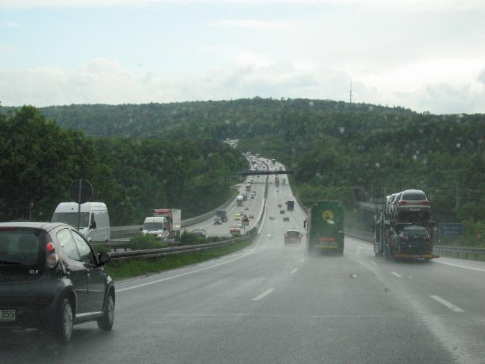За Ганновером опять зарядил дождь, местами он усиливался и переходил в сильный ливень с градом. Но немецкие дороги хорошего качества и чувствуешь себя безопасно даже при плохих погодных условиях. Никакой толкучки и суеты на дороге. Левый ряд практически всегда свободен для движения машин, которые пользуются возможностью «проехаться с ветерком». Основная масса машин едет со скоростью 130 км/ч. «Лихачей» не так уж много. Потихоньку пологая равнина сменилась ярко выраженной холмистостью, мы приближались к Баварии.