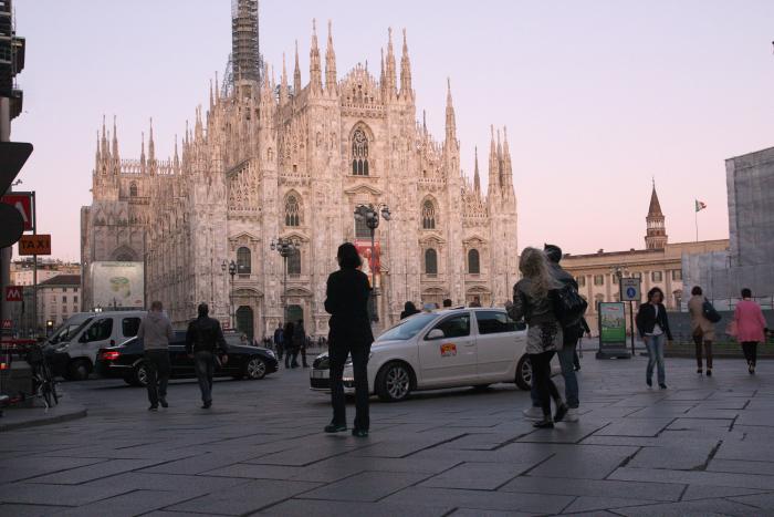 В 15 веке архитектор Браманте расширил церковь, построив здесь монастырь, где и хранится знаменитая фреска. Осмотрев церковь, мы отправились в центр Милана. Прокладывая дорогу к Миланскому собору на гугл картах, мы предполагали от Corso Vercelli дойти до центра минут за сорок, но силы не рассчитали. Прошагав минут тридцать, мы были также далеки от центра, как и в начале. Собака никуда не торопилась, выспавшись за целый день пути, она теперь охотно знакомилась с множеством новых запахов и местными собаками. Поэтому продвигались мы очень медленно. Мы решили немного поменять планы, зашли в кафе перекусили и вернулись к машине. Время приближалось к половине восьмого – час когда открывается центр города.