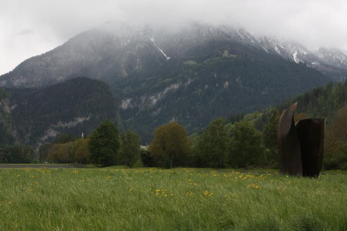 Прогулялись сами, дали побегать собаке. Спугнула тройку зайцев сидевших на окраине парковки. Дальше дорога шла только вниз. Снежные вершины остались позади, их сменили вершины поменьше и покрытые лесом. Зеленые луга заполняли пасущиеся коровы. Температура неуклонно ползла вверх – было уже +20С. Если Скандинавию мы проехали при +13-15С, Германию при +18С, в Швейцарии было холодно, то сейчас мы приближались к Италии. Дорожные указатели тоже, как будто следуя за погодой, поменялись на итальянские. Едем по итальянскому кантону Швейцарии.