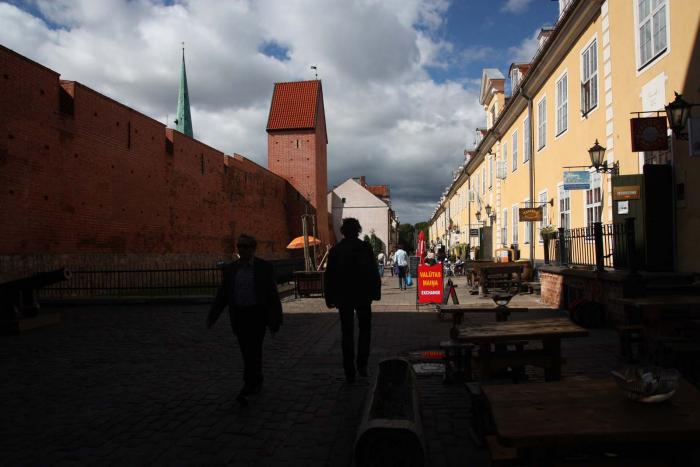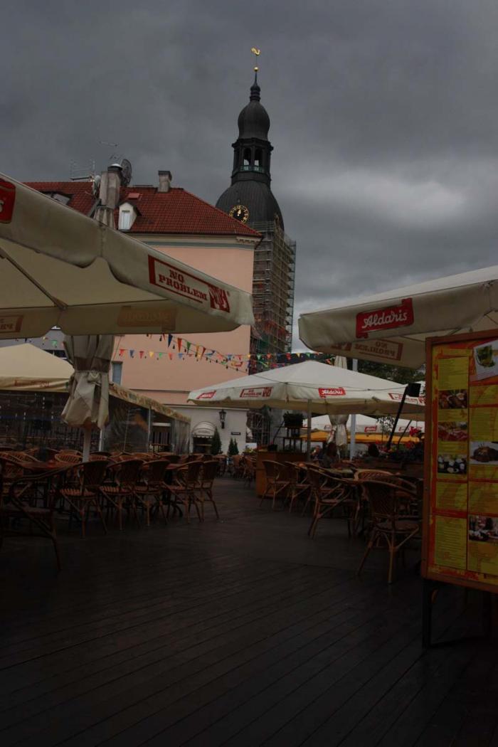 Во дворе организована сцена для различных мероприятий на открытом воздухе. Нагуляв аппетит, мы пообедали в кафе Cathouse (адрес Pils iela 9). Вкусно и недорого. Обед на двоих обошелся в 6 латов.