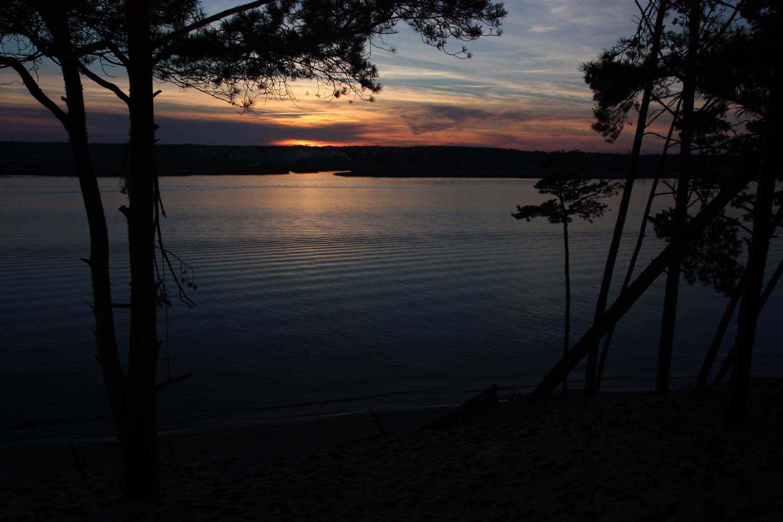 Приехали как раз перед заходом солнца. Песок, окрашенный заходящим солнцем, казался оранжевым, вдалеке виднелось спокойное чуть поддернутое рябью море. Внизу расстилалась Лиелупе. Мимо нас по реке плыл лыжник. Море, широкий речной плес, сосны, закат – зрелище величественное.