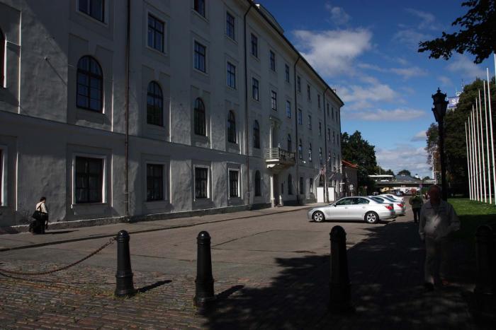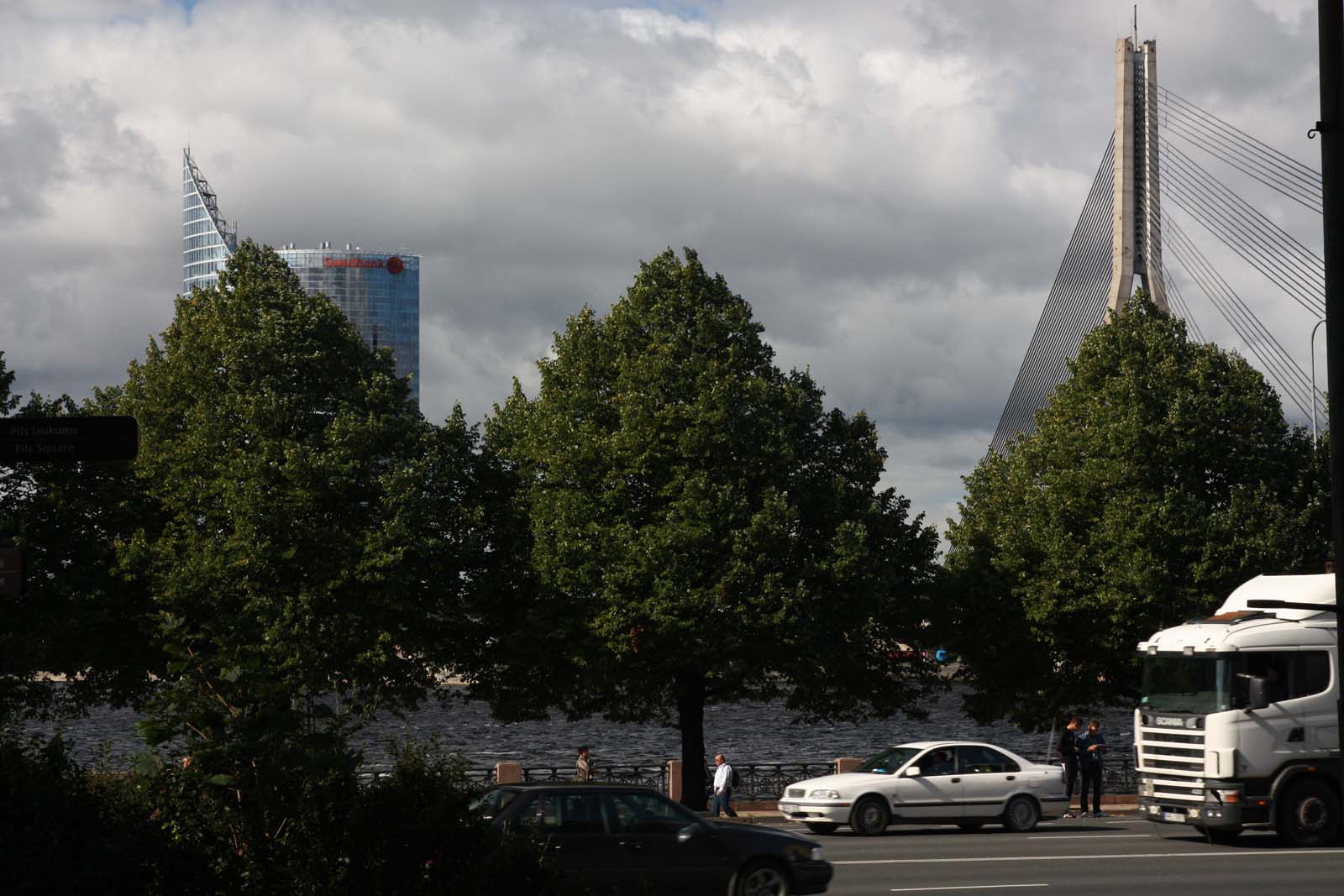 Дальнейшая дорога обошлась без приключений. На подъезде к Риге начался дождь, который, то усиливался, то прекращался. Под такой аккомпанемент мы и въехали в Ригу около 6 часов вечера (от нас на час отличается). Гостиница у нас была забронирована на юге города. Мы хотели погулять в центре, поужинать, а затем уже ехать в гостиницу. Мимо запланированной парковки на ул. Krišjāņa Valdemāra, 5a мы проскочили, так как навигатор не знает дома 5а, и на парковку нет указателей. Въезд на парковку не с улицы К.Valdemāra, а с бульвара Kalpaka. Что бы вернуться опять к парковке навигатор нарисовал нам путь через юг города. Я попытался сам вернуться, но поплутав, мы выехали все равно на дорогу, ведущую на мост. Как оказалось в Риге движение организовано по кругу, вокруг старого города, но все равно не понятно, почему навигатор прокладывал дорогу через другой берег Даугавы. Очередные «глюки». Мы смирились с этим и поехали в гостиницу, которая была как раз на другом берегу. Заселились, Отель Elefant оказался симпатичным местом с вежливым персоналом. На ресепшене мне разменяли пять латов мелочью, и это при дефиците монет! Отель тихий, уютный. В номере минибар, утюг. Утром очень плотный разнообразный завтрак. Один минус – отель далеко от центра, но на машине это не проблема. И еще, у отеля очень маленькая собственная парковка. Но я отвлекся. Заселились, сняли деньги в банкомате и поехали гулять в центр города. Запарковались на набережной Даугавы напротив Рижского замка, где сейчас находиться резиденция президента.