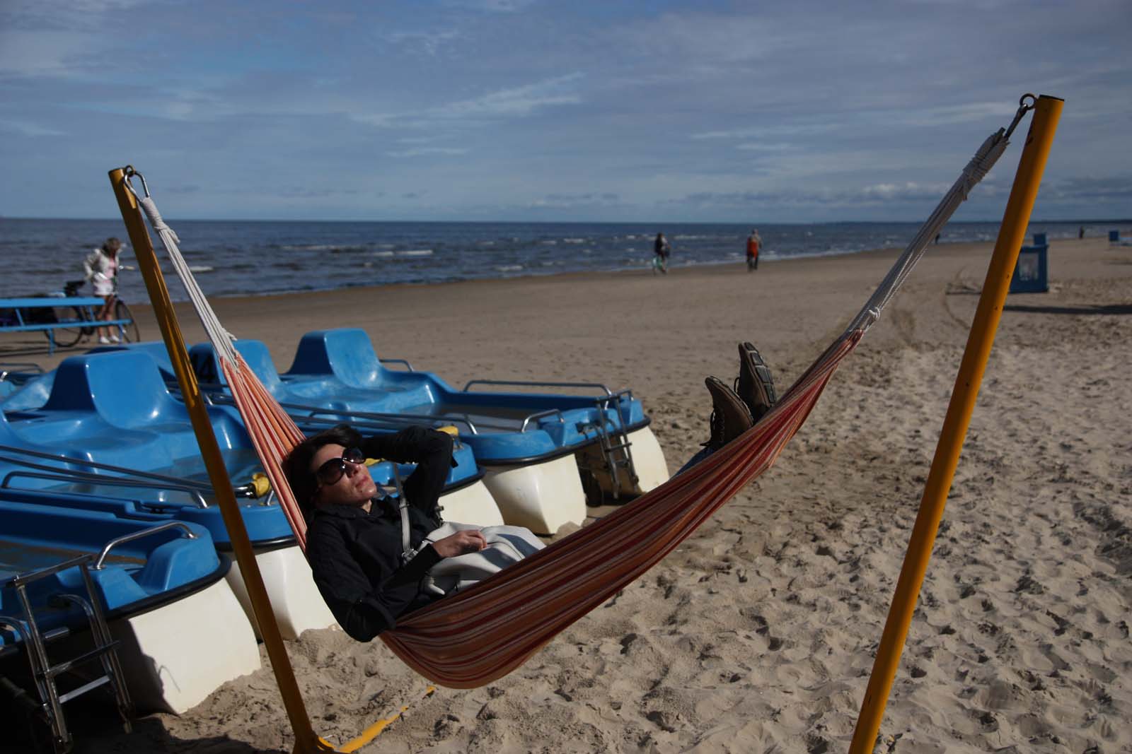 Был солнечно и тепло. Народ босиком бродил по пляжу. Некоторые смельчаки купались. На информационном табло сообщалась сводка погоды: Температура воздуха 17С, воды 15С. Неспешная прогулка по берегу под шум волн, крик чаек расслабляет и умиротворяет. В отличии от южной Европы в Юрмале в этом году не было лета. Весь сезон было прохладно и дождливо. Нагулявшись, мы выпили по чашке кофе и устроились в гамаках отдохнуть.