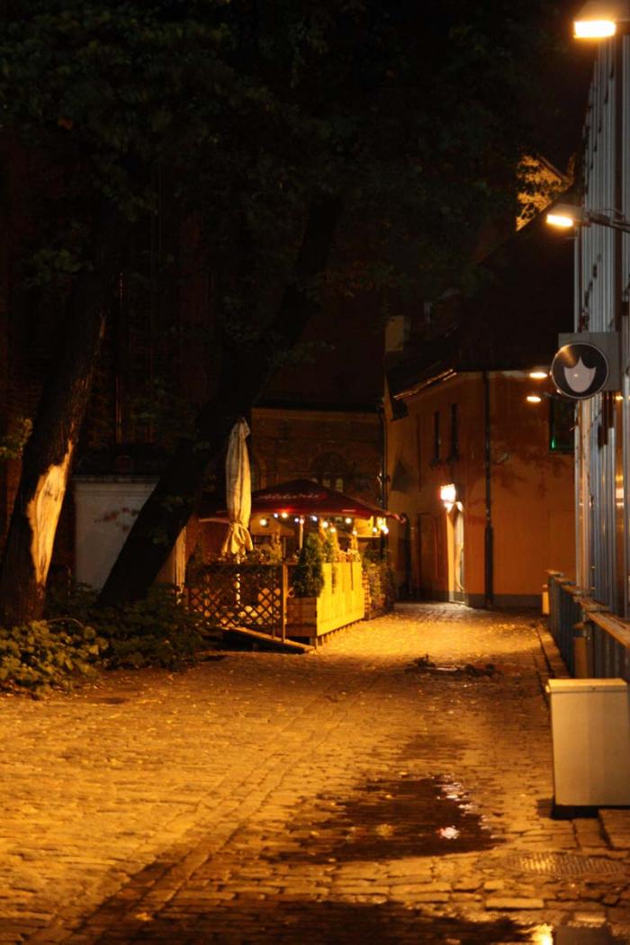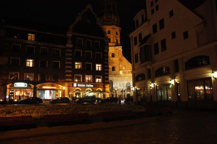 Ночная Рига впечатляет, желтые фонари таинственно подсвечивают средневековые здания, последние отражаюсь в лужах, дополняют картину таинственного средневекового города. Обошли мы вокруг собора Святого Петра, величественно возвышающегося в стороне от ратушной площади. Вышли на площадь с удивительным по красоте зданием братства черноголовых. Еще раз отметили, что Таллин и по этому параметру проигрывает Риге.