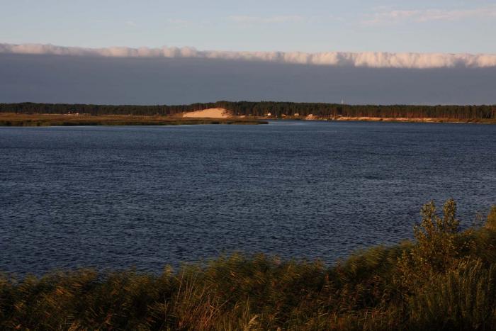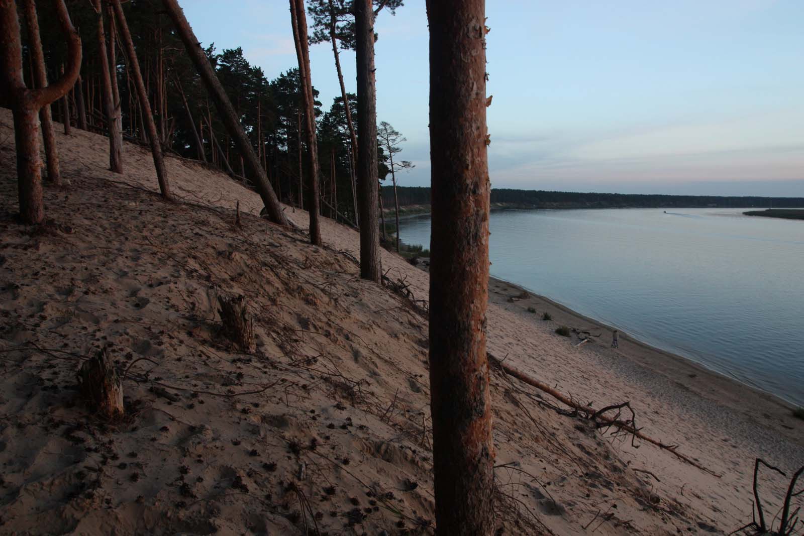 Белая дюна – памятник природы государственного значения – находится на берегу Лиелупе. Дюна образовалась в течение последних двухсот лет, расположившись перпендикулярно берегу моря. Длина дюны – 800 м, высота – 15-17 м. Причиной формирования дюны послужил прорыв рекой Лиелупе перешейка в 1757 году, образовавший новое место впадения реки в море. Отсюда раскрывается замечательный вид на Лиелупе, Стирну рагс и Буллюпе. Дорога проходит по берегу реки через сосновый лес. Солнце садилось, освещение для фотосъемки было наилучшим и мы, продвигаясь неспешным шагом, фотографировали замечательные виды.
