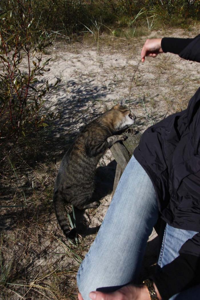 Присаживаемся отдохнуть. В эту поездку нам везет на любвеобильных животных. Не успели мы присесть, как из кустов вылезает большая кошка. Камышовый кот кричит моя жена. В Таллине мы посетили зоопарк, где видели этих крупных животных. Но все-таки это была обычная, очень крупная кошка. Видимо откормилась на рыбе. Обтерлась о наши ноги и заставила с ней играть.