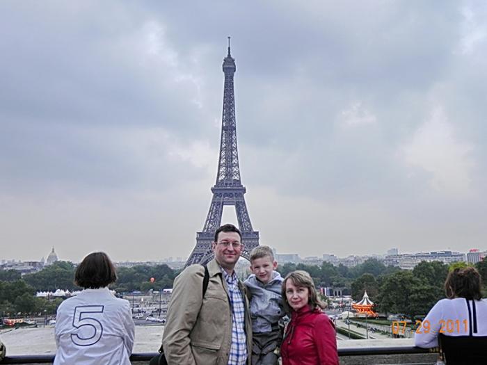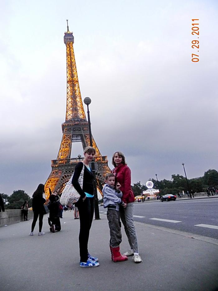 Доехав до Дворца, водитель объявил, что эта остановка конечная и все должны выйти. Мы, вообще то, хотели на этом же автобусе вернуться к «Нотердаму». Но почитав расписание движения автобусов в рекламном буклете поняли, что ни на этом, ни на следующем автобусе мы сегодня уже никуда не доедем. Просто автобусы ходят до 22.00, а времени было уже 21-15. Вот тут то и поняли, почему с нас взяли меньше денег, чем стоит билет. Сначала расстроились, но увидев Эйфелеву башню (лучший вид на башню) как то сразу успокоились, отнеся деньги за билеты к непредвиденным расходом. Да и урок на будущее получили — сначала все внимательно изучай, а потом действуй. Немного пофоткались на фоне башни