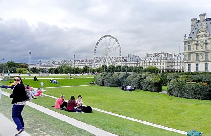 Только мы с сыном вошли под своды пирамиды, как снаружи разразилась гроза. То ещё зрелище — ты стоишь под стеклянным куполом, а снаружи по нему барабанит дождь и сверкают молнии. Кстати, в парках в Париже можно ходить по газонам и отдыхать на них. Лично мы, когда спешили в Лувр видели людей, сидящих н траве одного из центральных парков Парижа и мирно жующих сэндвичи.