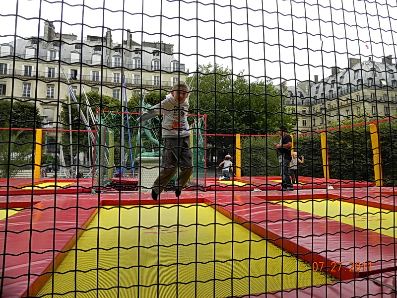 Народу как обычно много. Тут мы разделились — женщины пошли стоять очередь и покупать билеты, а мы с сыном пошли в парк Тюильри, где находится небольшой парк аттракционов.