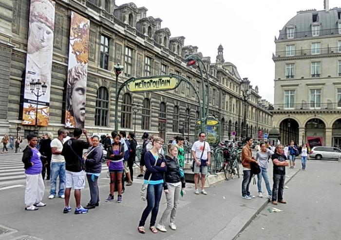 Ну, во-первых, как только мы вышли из Лувра, то на площади перед известной на весь мир станцией метро стены, которой сплошь увешены копиями или репродукциями самых известных картин, выставленных в вышеназванном музее