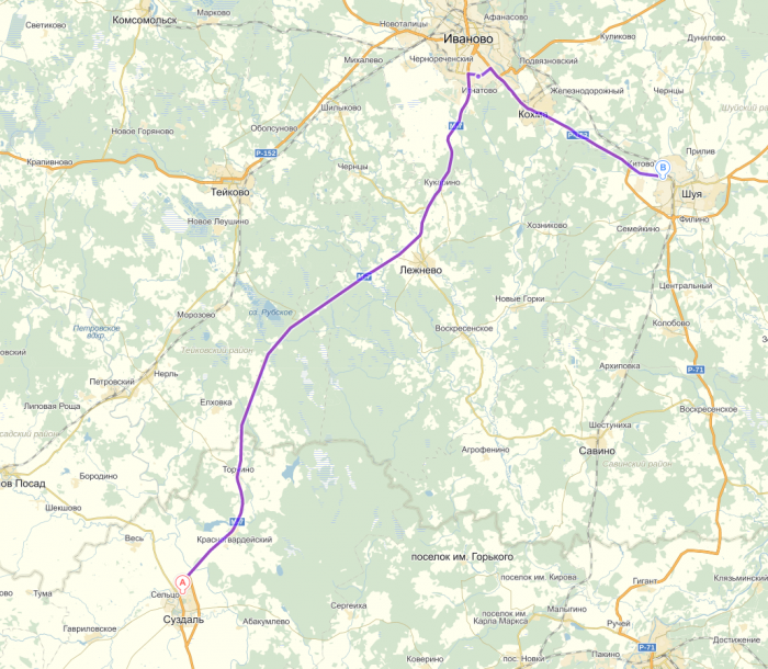 Изначально планировали ехать п.Цыгановка — г.Суздаль, но в ходе поездки, были приглашены по телефону в гости и решили заехать к подруге жены в город Шуя (Ивановская обл.) + 300 км. к запланированному маршруту.